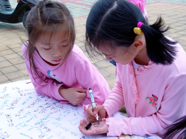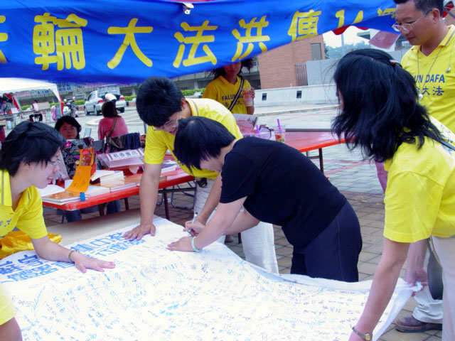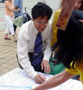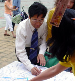 ![]() 明白真相的三年级小学生,帮忙讲起了真相,找了一位小娃儿要来签名,“我不会写名字。”这位幼稚班的孩子天真的说着,小学生征得小娃儿同意后,决定代签。边问名字,边写在手上问对不对,成了有趣的画面。 | ![]() 到场问候乡亲的中华民国福建省秘书长翁明志先生也到展位前签名支持,对于这么多乡亲了解真相签名支持法轮功,表示高兴。 |