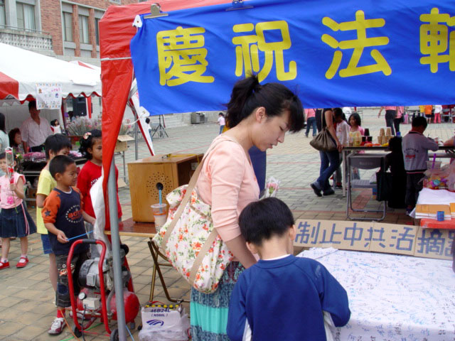 ![]() 法轮功摊位前,聚集大量人潮,写着“法轮大法”好的气球增加了不少过节的气氛。 | ![]() 一位妈妈拉着一年级儿子的手走向摊位,并儿语化的向儿子解释:大陆把人肚子里的东西拿去卖,这是不对的,我们要支持人权,一起来签名反对。 |