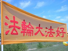 在与中国城广场隔街相望的一片开阔的草地上,在阳光下愈发鲜艳夺目,远远的就映入人们眼帘的是:黄纱紫底金字的“世界法轮大法日”、橙色为底的“法轮大法好”、及蓝底黄色的英文横幅“FALUN DAFA”(法轮大法)、“World Falun Dafa Day”(世界法轮大法日)大横幅。九条写有中英文“法轮大法好”的五彩旌旗,一字排开,随风飘动,令人心旷神怡。