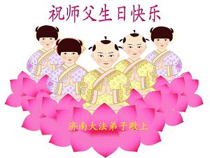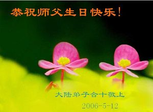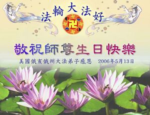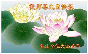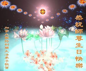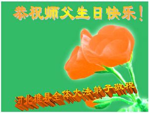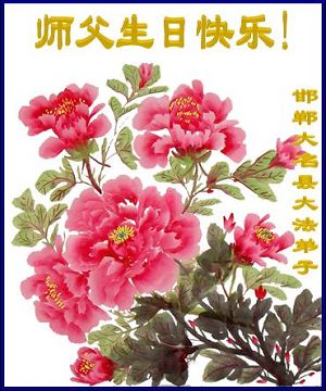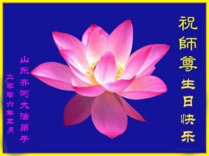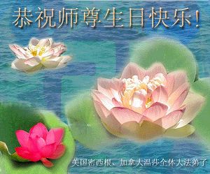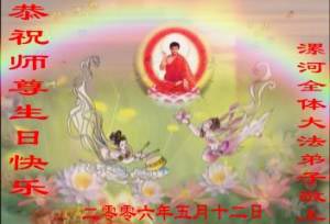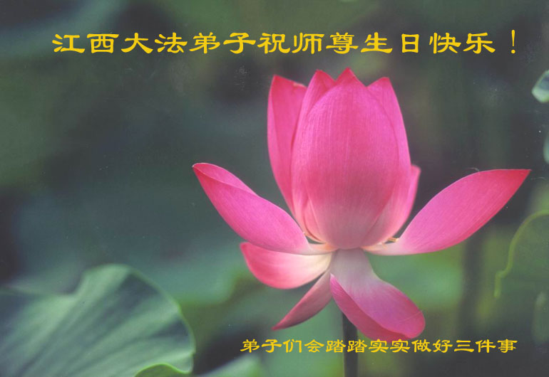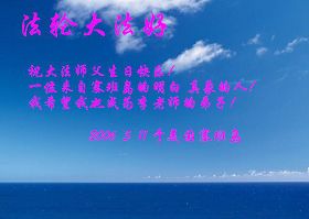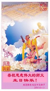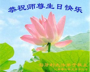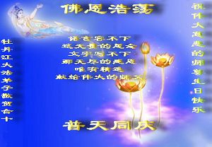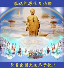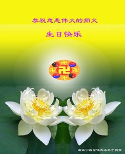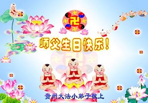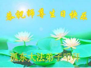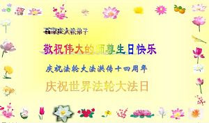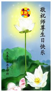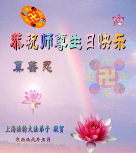 在这普天同庆的日子里,弟子祝贺师父生日快乐,在过去一年的修炼中,弟子走了弯路,内心深感愧对师父的慈悲苦度,在这个伟大的日子里,弟子向敬爱的师父发誓,一定要走回正法修炼之路,不辜负师父的苦度。
