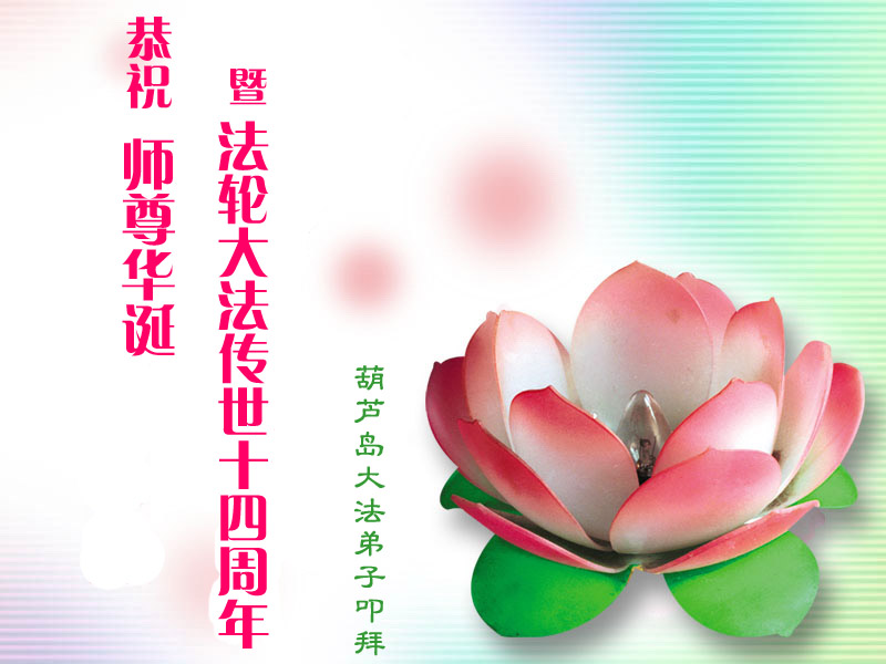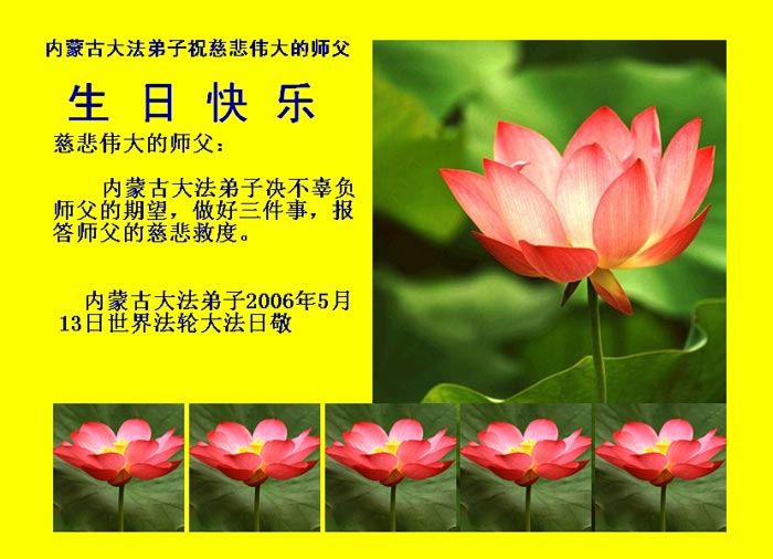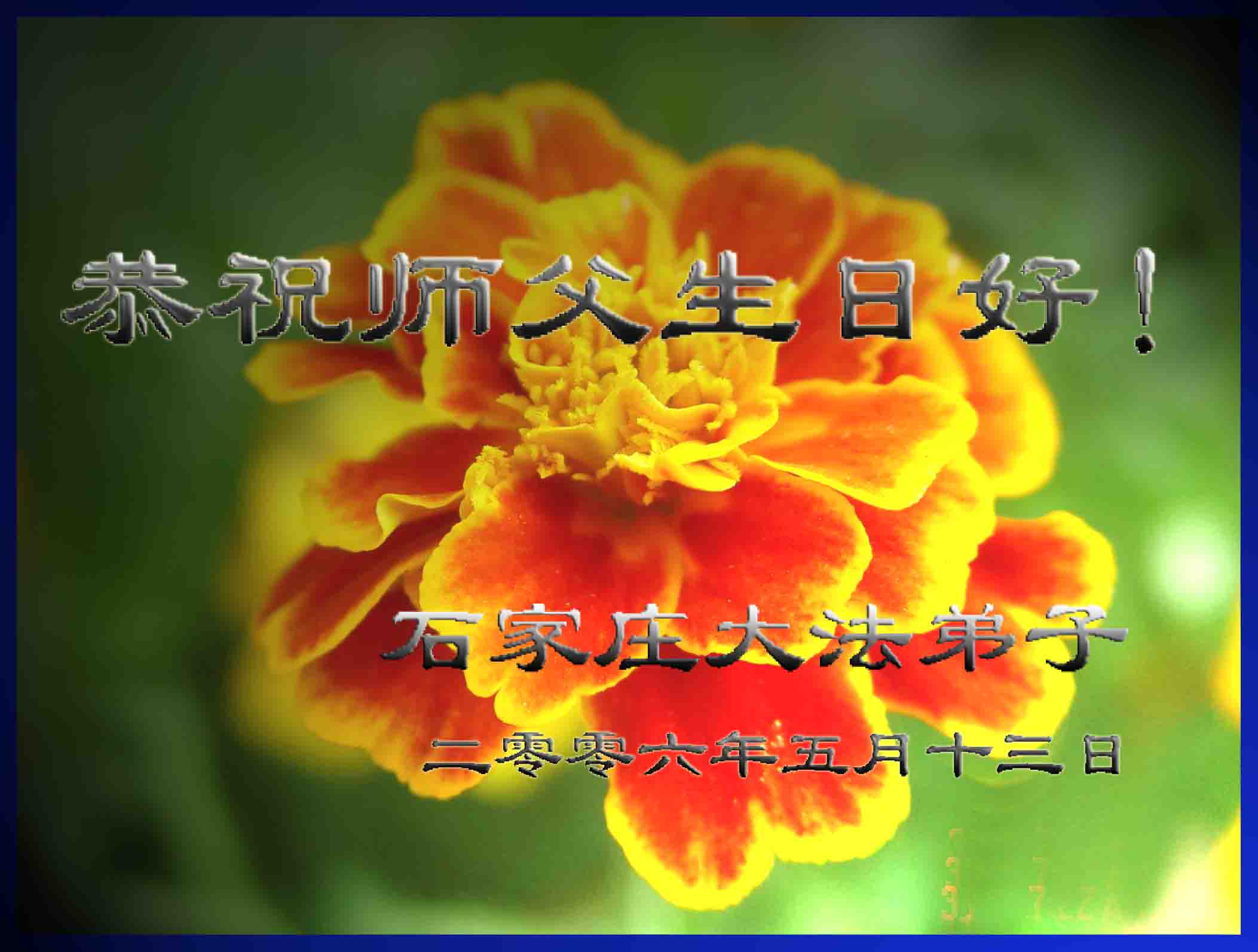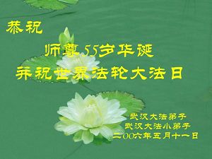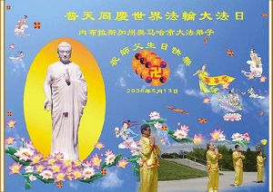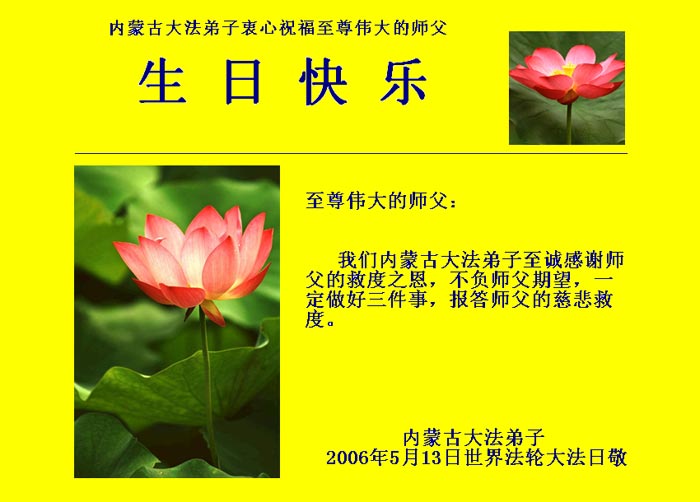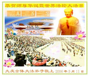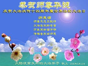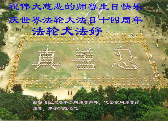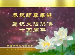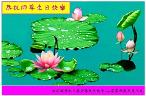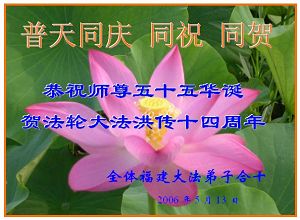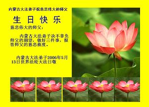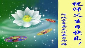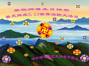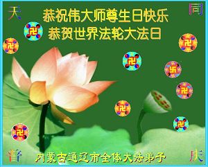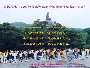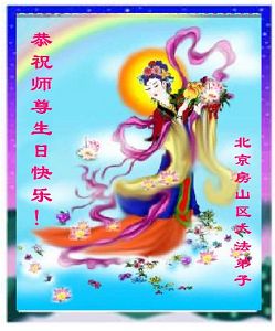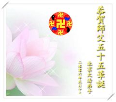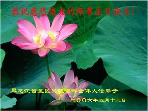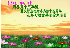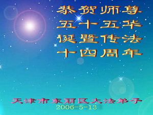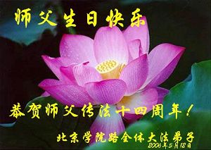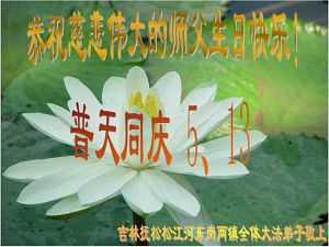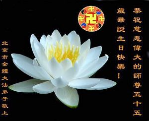 在五月十三日慈悲伟大的师尊五十五岁华诞到来之际,在法轮大法洪传十四周年、第七届“世界法轮大法日”到来之际,北京市全体大法弟子向慈悲伟大的师尊致以最崇高的敬意:恭祝师尊生日快乐!衷心的道一声:“师父,您辛苦了!”请师父放心,我们全体大法弟子一定牢记您的教诲,更加勇猛精進,切实做好三件事,学法修心、正念正行、广传真相,救度众生,完成正法时期大法弟子的伟大历史使命,不辜负您的慈悲苦度!