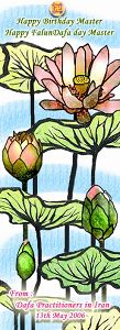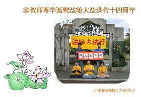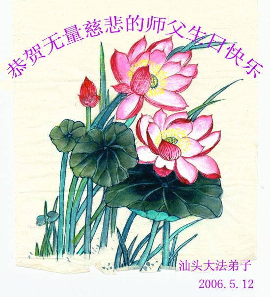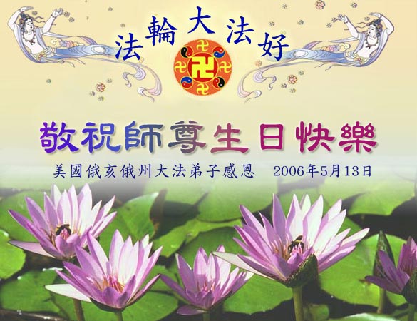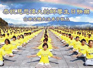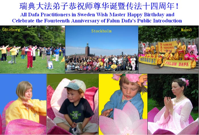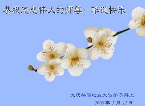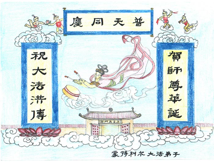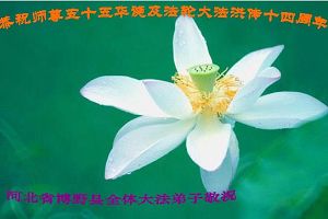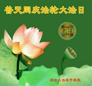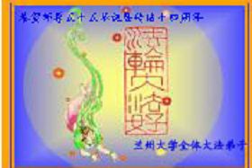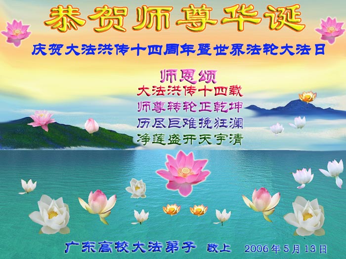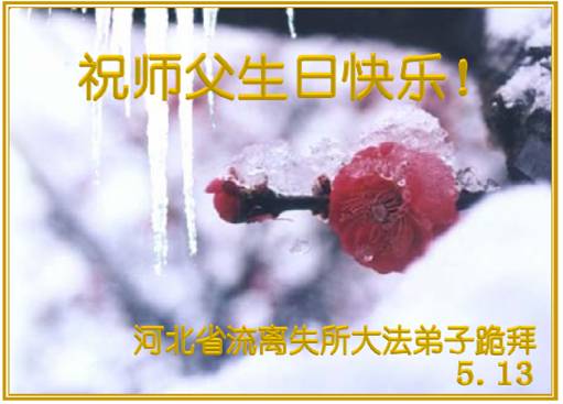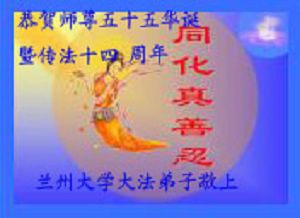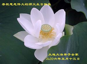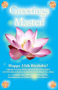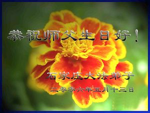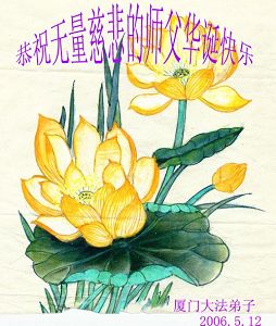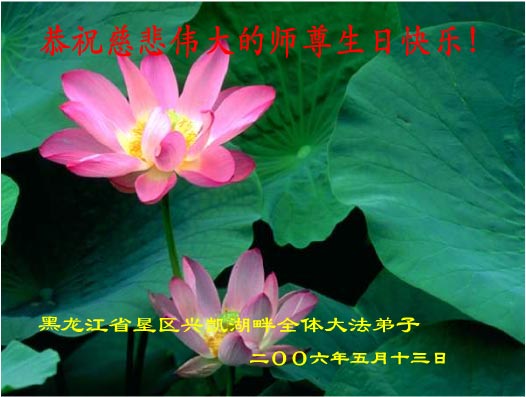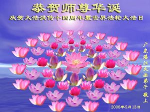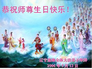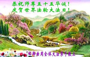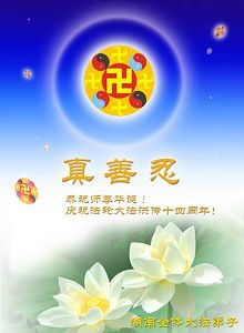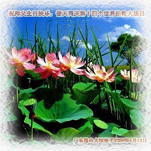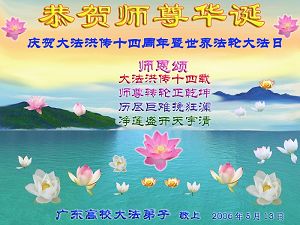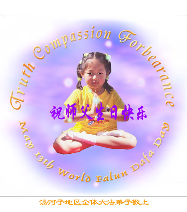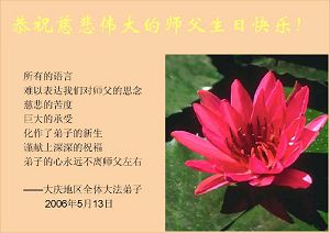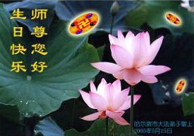 在五月十三日慈悲伟大的师尊五十五岁华诞到来之际,在法轮大法洪传十四周年、第七届“世界法轮大法日”到来之际,北京市全体大法弟子向慈悲伟大的师尊致以最崇高的敬意:恭祝师尊生日快乐!衷心的道一声:“师父,您辛苦了!”请师父放心,我们全体大法弟子一定牢记您的教诲,更加勇猛精進,切实做好三件事,学法修心、正念正行、广传真相,救度众生,完成正法时期大法弟子的伟大历史使命,不辜负您的慈悲苦度!