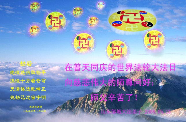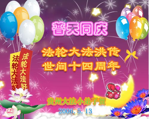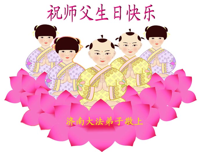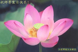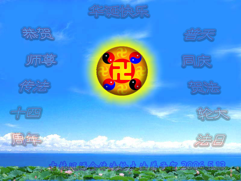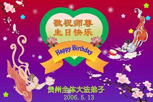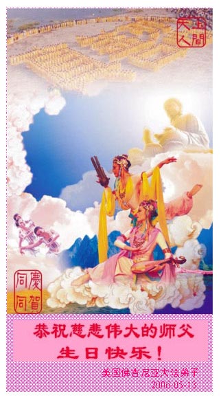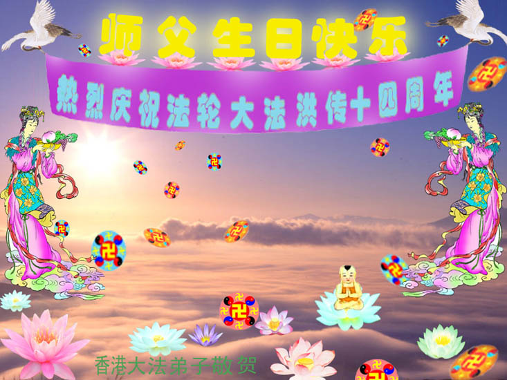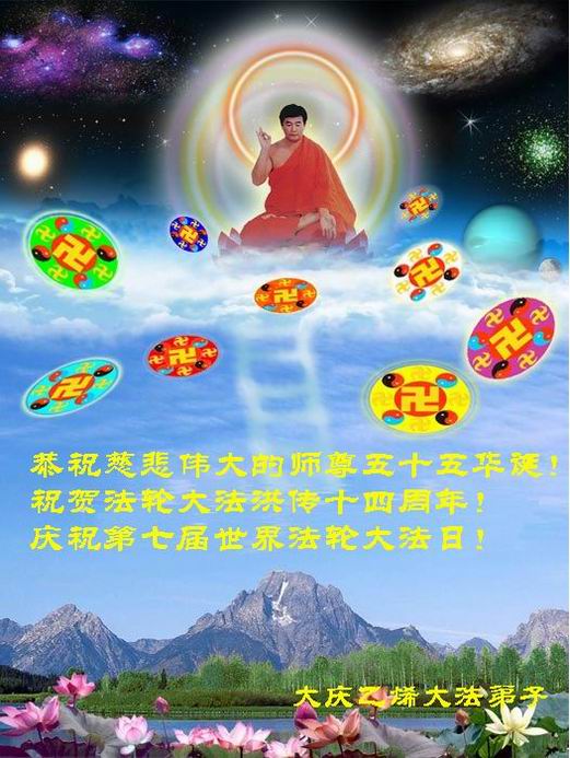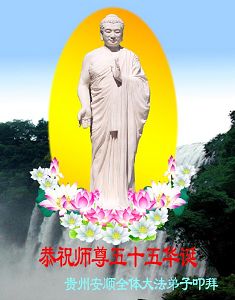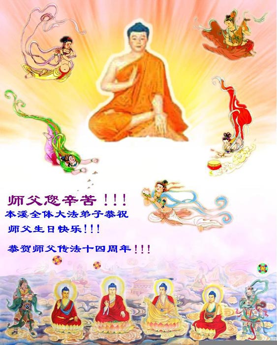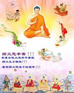 在这普天同庆的大法洪传十四年的喜庆日子里,弟子衷心的愿您五十五岁华诞快乐!师父辛苦了!