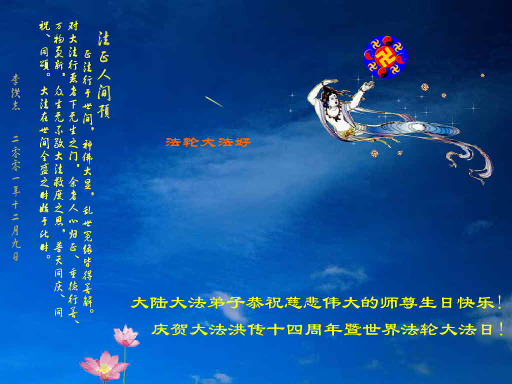 普天同庆法轮大法洪传世界十四周年!同庆世界法轮大法日!