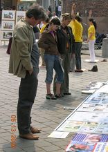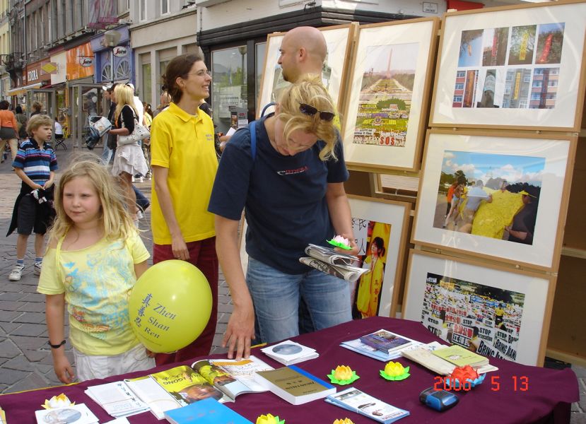 观看功法演示和真相图片的人群来了一拨又一拨。祥和的功法和发生在中国的残酷迫害形成鲜明对比,人们不禁问:这样美好的功法,这是为什么要迫害?!学员进行了详细讲解。了解真相的人们,纷纷表示要求比利时政府官员帮助制止中共虐杀法轮功学员的恶行。