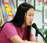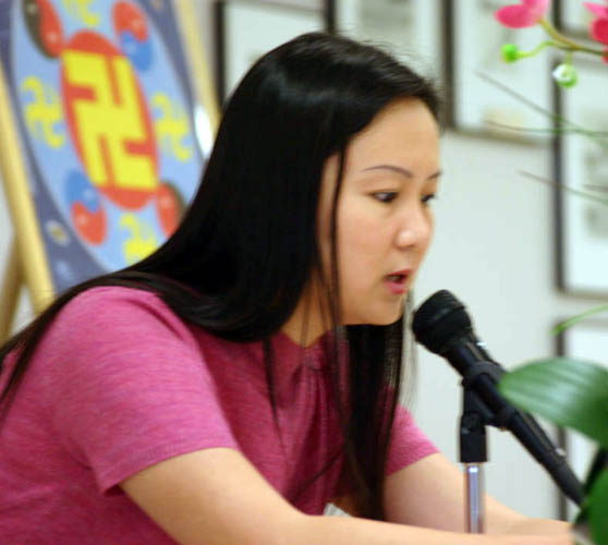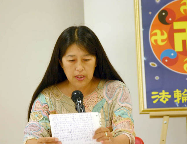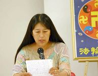 休士顿学员庭瑜女士在发言中说:我得法一年多,在没有修炼法轮功之前,曾死过一次。自己认为未死成,可能神会给我使命,得法之后以往十多年的恐吓症没有了。有时候我和丈夫因小孩子的教育方式有些争执,开始时,我认为我怎么能够对丈夫低三下四,后来我用“真善忍”对照自己,认为自己没有做好,我只有真正的按照“真善忍”去做,周围的人才能得法,有两次我就非常诚意的向丈夫道歉,后来丈夫也按照“真善忍”去修了。