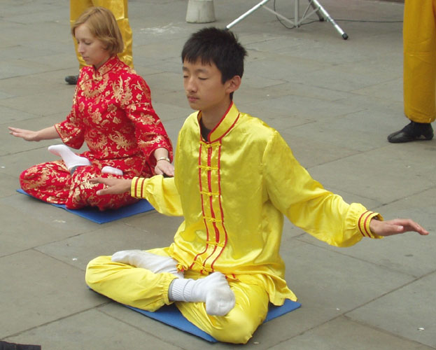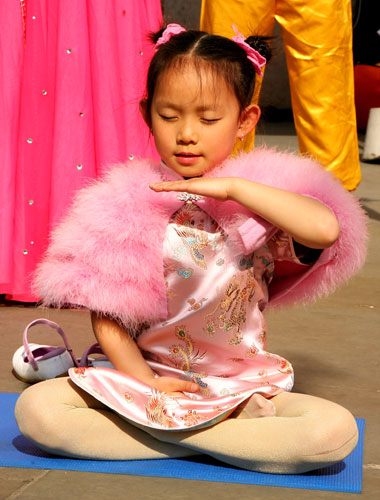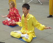 学员们还向观众演示了法轮大法功法。祥和的功法吸引着人们的视线,有的观众向学员问询了炼功点的时间地点,希望学炼法轮功。