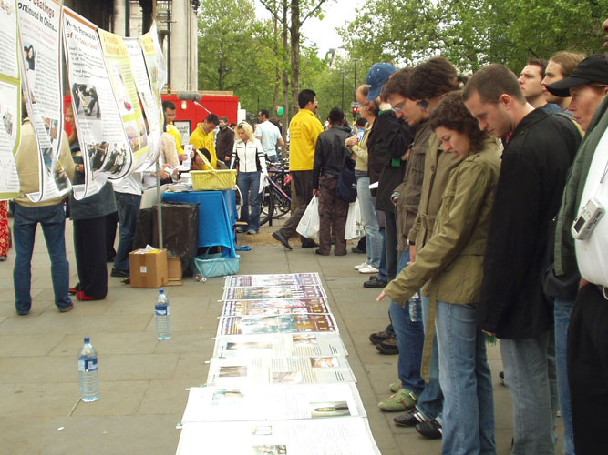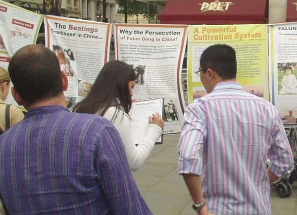 在活动场地的一边,学员们挂出了法轮大法学员在中国被奉行“假、恶、暴”的中共邪*党-残酷迫害的图证。迫害的残酷使人们震惊,中共的邪恶和其对善良的践踏使人们义愤。许多人在谴责中共迫害法轮功,要求联合国、英国政府及国际组织彻底调查中国劳教所等关押法轮功学员的地方、制止迫害的请愿书上签名。