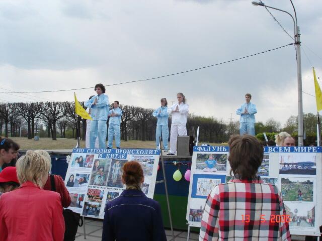 周末的公园,天清气爽,游人如织。法轮功学员用广播喇叭向人们讲述法轮大法日的由来,身着炼功服向人们展示优美舒缓的功法,并揭露邪恶中共对法轮功修炼者的残酷迫害。两名芭蕾舞学校毕业的年轻大法弟子表演自己创编的舞蹈,庆祝节日,感念师恩。