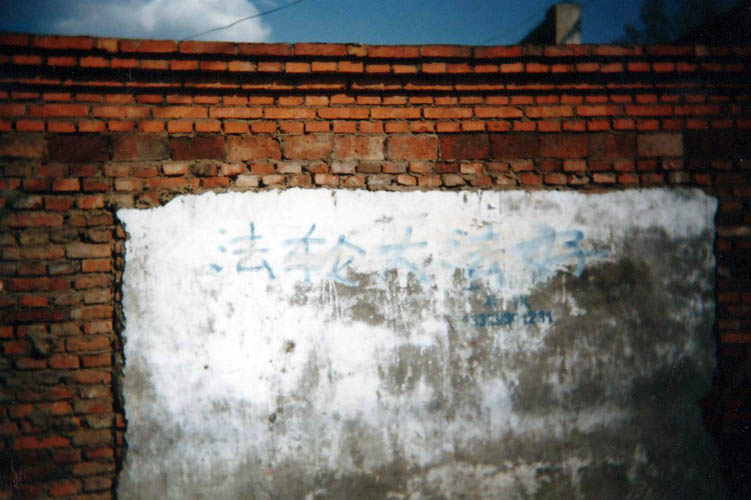 这户人家的墙壁上原喷有“法轮大法好”的真相标语,后被邪恶之徒用白灰涂抹覆盖。一场春雨过后,大法真相标语显露出来。