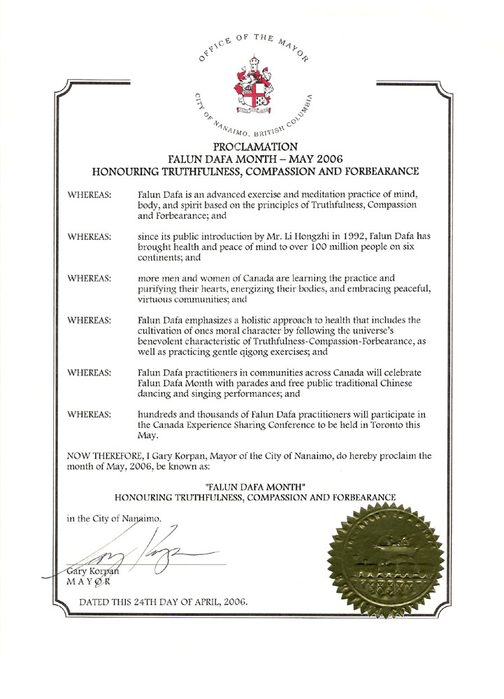 鉴此,我,那尼莫市市长加里·科潘(Gary Korpan),特此褒奖2006年5月份为那尼莫市