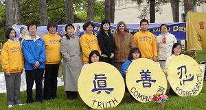 一早,法轮功学员就来到当地著名的森林公园,布置好了庆典现场。然后,大家一起炼功、学法、发正念。学员的年龄从6个月到73岁,一同沐浴在“真善忍”中。