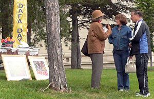 学员认真的给每一个驻足的人讲真相。人们对“正法之路”的图片很感兴趣,也很想更多的了解法轮功。
