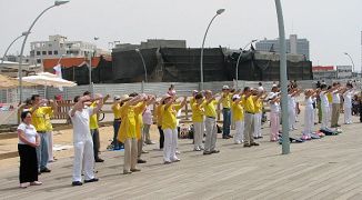 而后,学员们来到了当地最受欢迎的休闲场所-特拉维夫港口。那里举行了集体炼功活动和文艺表演,吸引了众多的游人。