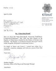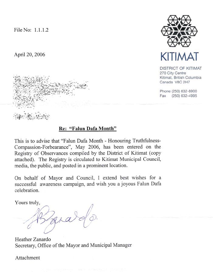 兹通知2006年5月“法轮大法月 --- 崇尚真善忍”已经录入克特马特(Kitimat)区编纂的庆祝登记册(附上影印件)。该册在克特马特市议会、媒体、及公众中发放,并张贴于显著地点。
