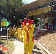 一群群的孩子们跑到路旁的摊位和学员们学折纸莲花。在孩子们的带动下,大人也过来跟着学。学员一边教摺莲花,一边介绍法轮功。