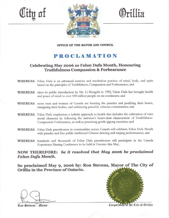 鉴此,我,罗•史蒂文斯(Ron Stevens),奥里利拉市市长,于5月9日宣布2006年5月为