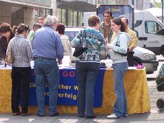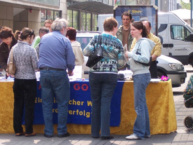步行街两旁的商店里来购物的人很多,当人们经过信息日的展位时,都被这种发生在中共政权下世间罕见的邪恶残暴的血腥行径所震惊。很多人立刻在致德国政府的请愿书上签了名,要求德国政府本着普世的道义和良知,参与立即彻查和制止中共集中营和劳教所里这种系统化的谋杀和迫害事件,并要求立即释放这些无辜的被关押者。