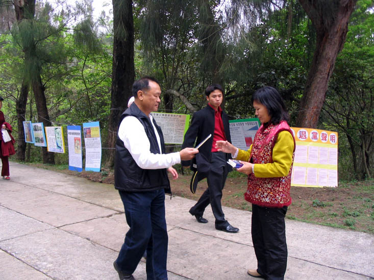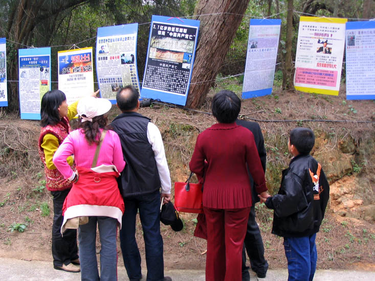 长期以来,学员们利用着周休二日的假期,自发性的到金门的观光景点“太武山”,摆展板讲真相,中共对法轮功学员活体摘除器官并焚尸灭迹事件曝光后,学员们向爬山的乡亲及游客们揭露这血腥的事实,呼吁大家认清共产党伪善的嘴脸,并且避免去大陆换肾等器官,以免成了杀人的帮凶。