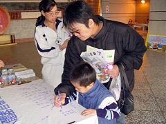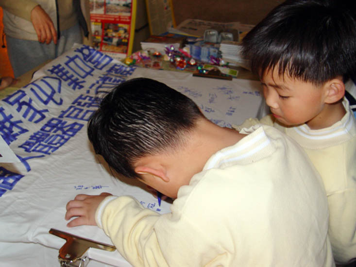 “儿子签吧!”一位在公家机关上班的何先生,表示从媒体上知道此事,看到现场有征签活动,很兴奋的叫两位还是幼稚班的儿子,为正义签名!