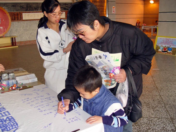 在镇公所上班的萧小姐是从网路上知道这个消息的,主动的向学员索取大.纪.元;特刊想进一步了解,并牵着儿子的手签名,在这历史的一刻同为正义发声。