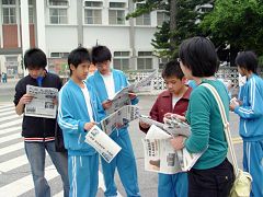 这天适逢金城学区运动会,县立体育馆活动结束后,金门法轮功学员们风尘仆仆的赶到金城国中运动场。孩子纯真的心灵,在面对中共活摘法轮功学员器官牟利一事时,初期是震惊与不忍观看,经过学员的解说后,转而是奔走相告,让周遭的同学知悉,共同上了一堂令人震撼的人权教育课程。
