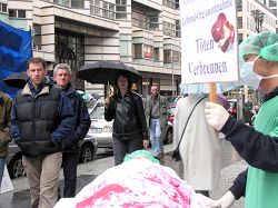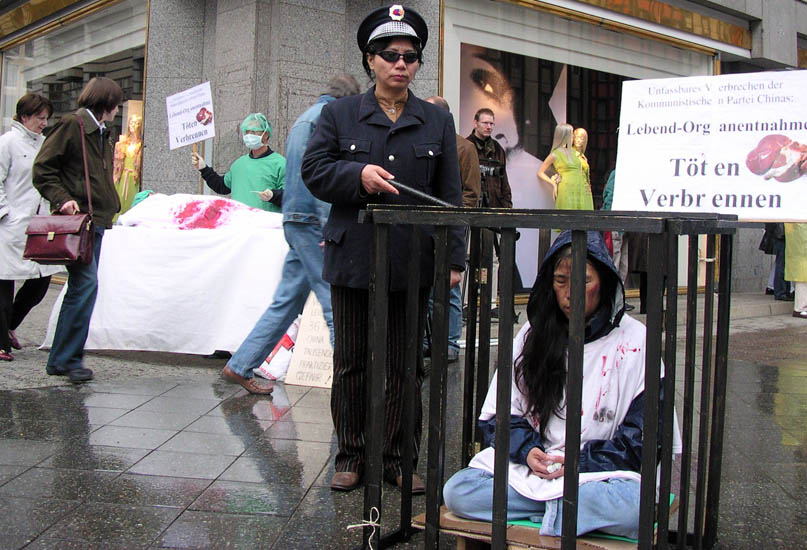 真人模拟演示吸引了很多路人的目光。一个人躺在高高架起的“手术台”上,蒙着一块“血迹斑斑”的白布。身着白大褂的“医生”立在一边,一手拿着手术刀,一手举着一个牌子,上面用德文写着:“活体摘取器官-杀害-火化”。为了让行色匆匆的柏林人能在一走一过之间就能够了解真相,学员们还通过大喇叭简要的告诉人们在中国发生的对法轮功学员的群体灭绝迫害。
