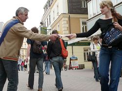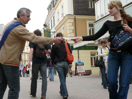 最近一次在布尔诺的历史中心举行的抗议活动是两周以前。活动的地点仍然和以前一样,那天的天气很好,气候温暖,人们都主动来了解迫害和器官摘除的情况。经常可以看到人们前来索取资料,边走边仔细的阅读,但在走了几步之后,他们停住了,转身直奔签名桌。