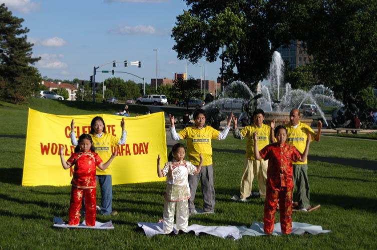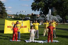公园里阳光明媚,春意盎然,学员们祥和的炼功场吸引了许多游园客,人们纷纷索要大法介绍材料,有人赶紧拿出相机拍下了珍贵的炼功场面。一位中年男士走上前来手指着我们的横幅说,“我反对中国政府迫害法轮功。我支持你们, 祝你们好运!”