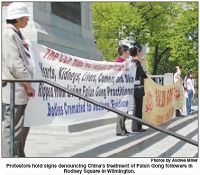 ![]() 抗议者手持谴责中共虐待法轮功学员的横幅 |
