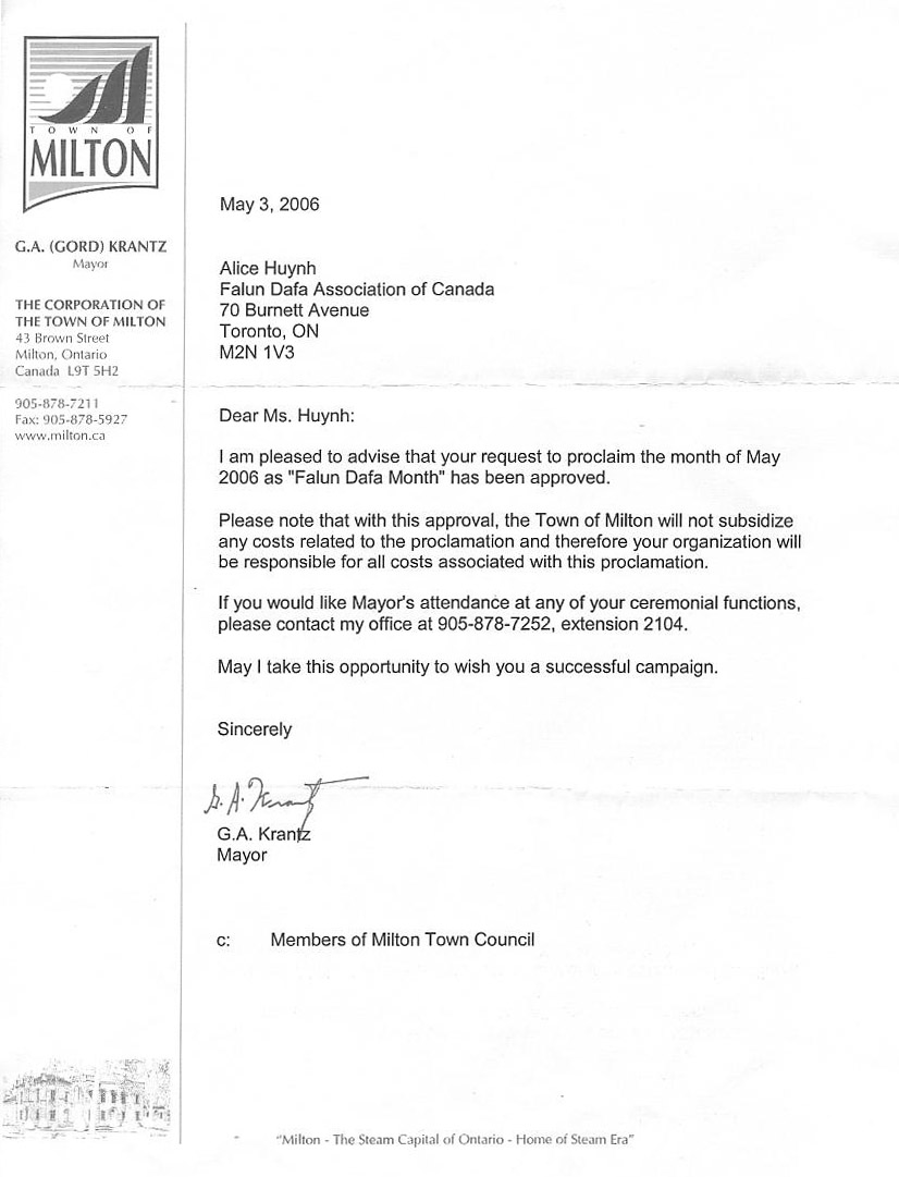 克兰兹市长并在信中诚挚祝愿法轮功学员们的活动取得成功。
