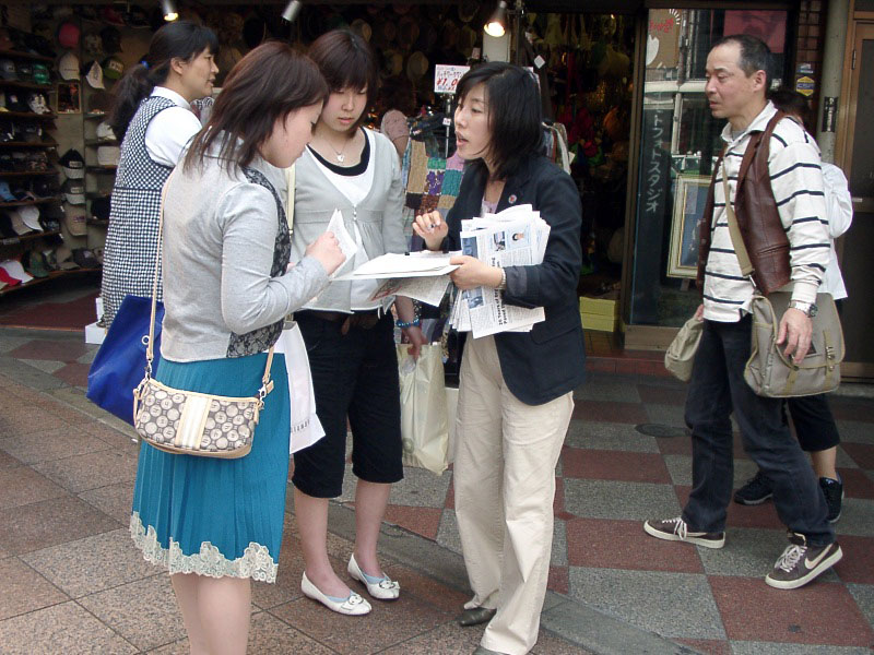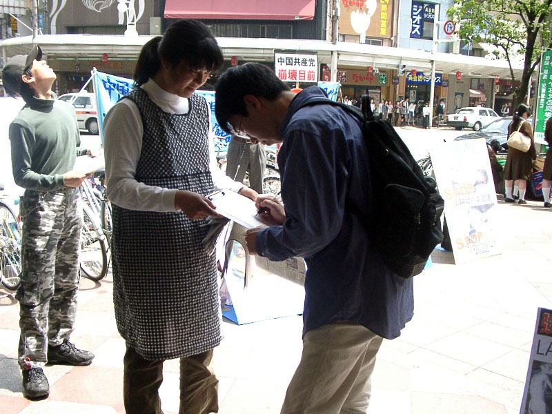 京都是个旅游胜地,在街头能看到各国人的面孔。许多外国人了解了迫害真相后也纷纷签名表达制止迫害的心声。京都是个文化古都,有许多的大学聚集了大量世界各国的留学生,中国留学生更是随处可见。一些过往的中国留学生了解了迫害真相后,非常气愤中国共产党对本国民众做出如此丧尽天良的恶行,他们在签名声援停止迫害的同时也声明退出共产邪*党-的相关组织。也有受共产邪*党-洗脑教育毒害较深的中国人不愿承认迫害现实,对法轮功学员的活动不理解甚至恶言恶语。无论遇到什么态度的人,学员们都本着善心努力向对方讲真相。