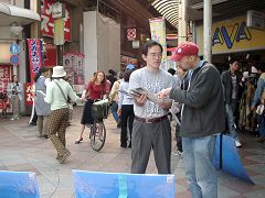 第一天的活动是在京都繁华的商业街的入口。法轮功学员通过展示横幅、放置展板、街头演讲、发送真相传单等方式告诉人们在中国劳教所大量发生着活体摘取法轮功学员器官的罪恶行径,呼吁人们帮助尽快制止发生在中国持续7年的对法轮功的迫害。