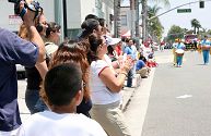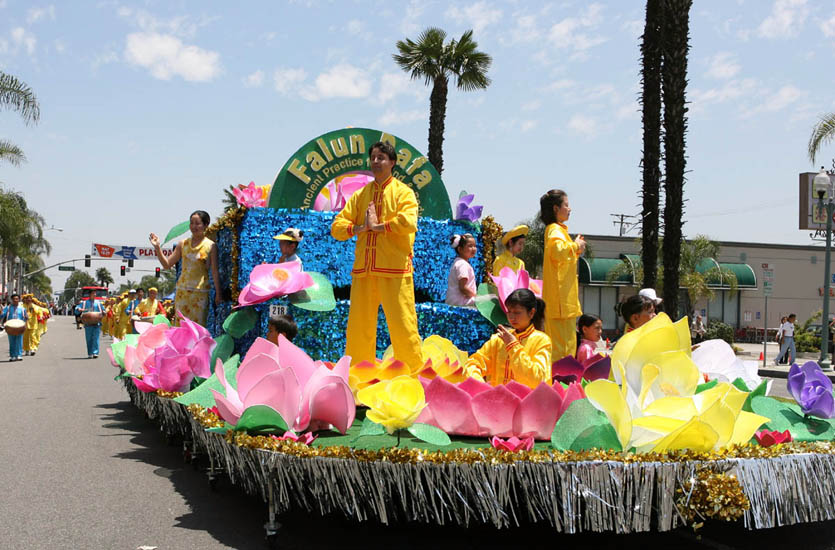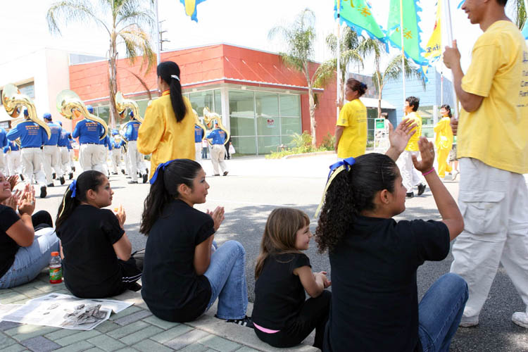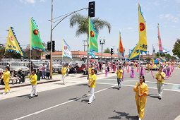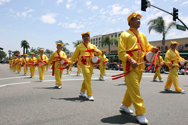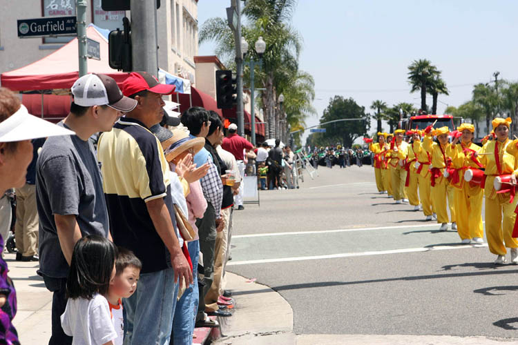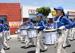 来自旧金山的法轮功天国乐团美西分团是第一次在南加州亮相,他们清一色的蓝衣白裤蓝帽,简朴端庄。近200人的乐队浩浩荡荡通过嘉伟大道,步伐整齐、节奏鲜明、鼓乐齐鸣,《美丽的美利坚》和《法轮大法好》的乐曲震撼人心。有些观众举起双手却忘记鼓掌,目不转睛地盯着乐队。有些学生一边欢呼尖叫着,一边在人行道上跟着乐队跑。
