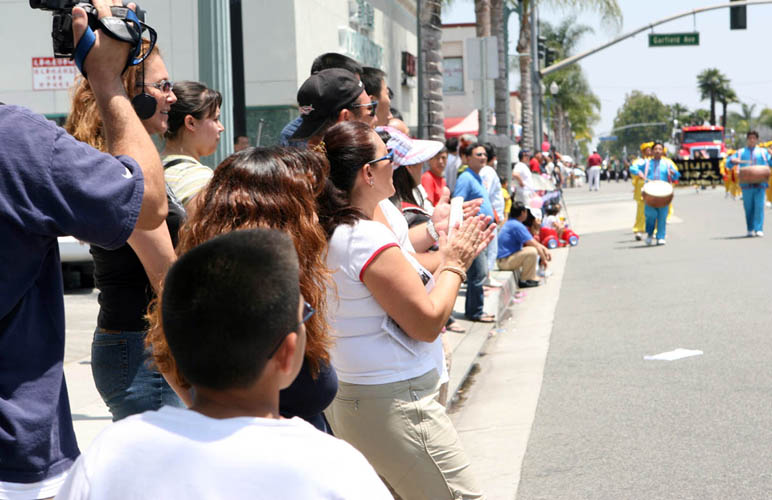 上午11点开始,200多支队伍浩浩荡荡穿过嘉伟大道(Garvey Blvd.),把一连4天的庆祝活动推向高潮。法轮功是阵容最庞大的队伍,由军乐队、仙女舞蹈队、腰鼓队和花车组成。队伍的最前面是“祝蒙特利公园市建市90周年”大横幅,“法轮大法洪传世界”和“法轮大法”一红一蓝两个横幅紧随其后。队伍中,声势浩大的军乐队、翩翩起舞的仙女、威武雄壮的腰鼓,以及花车上的功法演示,向大众展示了真善忍的美好。沿途观众报以热烈的掌声、欢呼声。