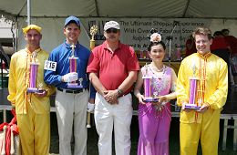 ![]() 法轮功分获军乐队、花车、腰鼓队第一名和舞蹈队第二名。 |