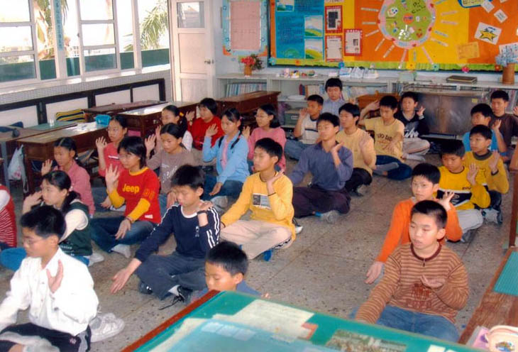 彰化市泰和国小教师陈金美,1999年开始将《转法轮》介绍给班上的孩子阅读,晨间自习时由班长带领全班读法、午餐时间观赏修炼心得影片、午间休息时间炼功、道德伦理时间心得交流。孩子们有矛盾自动会对照法理做好,心性在不知不觉中提升,智慧也就开启了,更精进于课业学习、努力做好自己负责的工作。家长都说孩子更乖、更懂事了,孩子们的人生观、世界观、宇宙观也无形中拓展了。每个孩子都表现的有礼貌、乐观知足,孕育出一颗凡事自动自发、自我要求、为别人着想的善心。