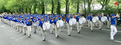 天国乐团威武雄壮,《法轮大法好》等乐曲响彻曼哈顿第五大道。纽约人看着这个由法轮功学员组成的一百多人的华人大乐团,既惊讶又欢喜,纷纷拍照,有位老者还和着拍子手舞足蹈。