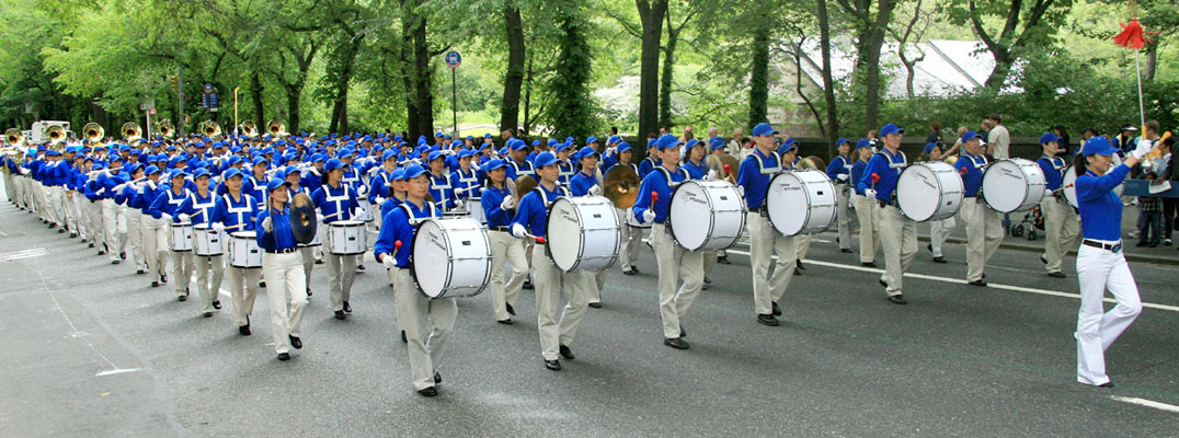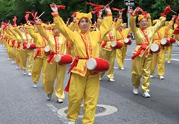其后的炼功队伍向纽约人展示了舒缓优美的法轮功功法。神气的腰鼓队员们身着亮丽的金色炼功服,配上红色的腰鼓,在第五大道上吸引了许多人的目光。