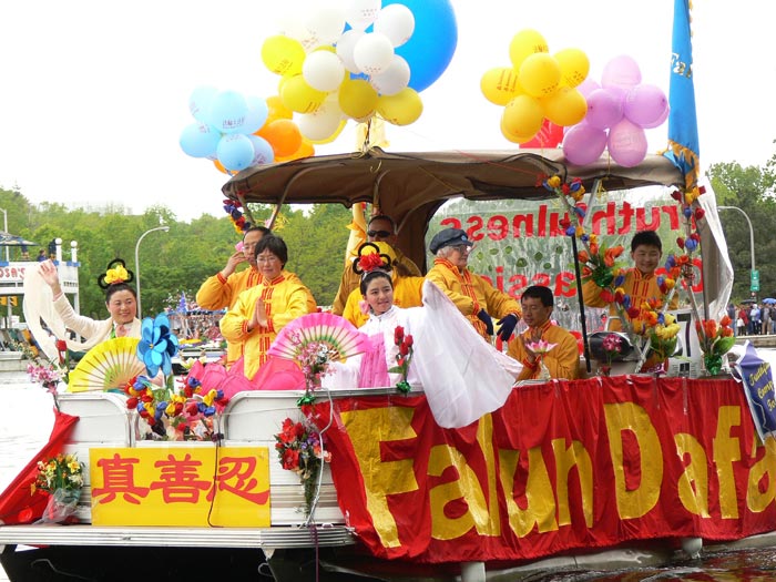 法轮功学员穿着黄色的炼功服在花船上炼功,两位装扮成仙女的学员在莲花中向观众致意,岸上的学员还给游客赠送印有“法轮大法好”字样的气球。