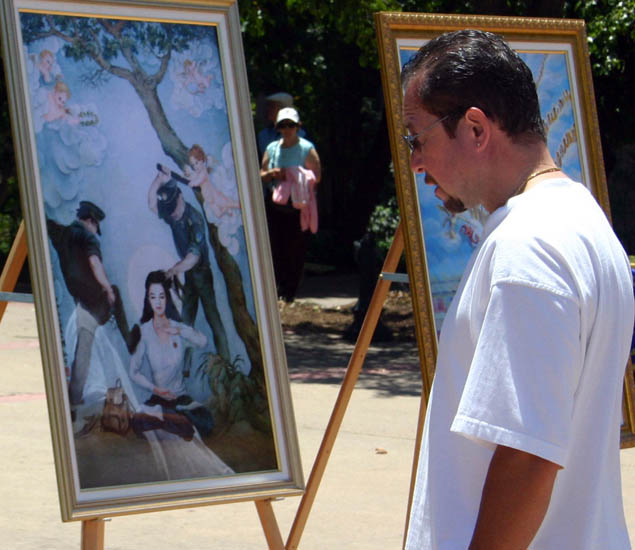 人们不断的从不同的方向走过来,他们通过法轮功学员的艺术作品,了解到画作背后的故事,善良的人被震撼着,他们表示深深的同情,有人流下无声的泪水,有人询问该如何帮助,有人在签名册上写下姓名……还有很多人表示想学炼法轮功。看到一个个生命被救度,还有比这更值得的吗?