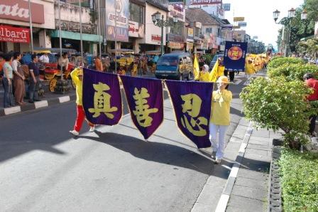 这是日惹市民第一次看到法轮功游行,游行队伍经过日惹市最热闹最著名的马里欧•波洛长街,那是游客集中的旅游景点,有很多人向学员索取法轮功资料,愿意更进一步认识法轮功。