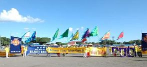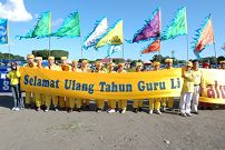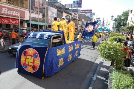 13日上午至中午,百余位学员在卡嘉•玛达大学的大礼堂集体学法。午餐后他们从市中心的大广场出发,沿着大街要道举行了一个半小时的游行。展示的各色旌旗及横幅有数十个,包括“法轮大法好”、“真善忍”、“庆祝法轮大法洪传世界14周年”、“师尊生日快乐”、“世界需要真善忍”、“法轮大法是宇宙大法,也在印尼洪传”等等。随后有身穿金灿灿黄衣的腰鼓队,一阵阵中国古典音乐悦耳动听,腰鼓队的成员个个精神抖擞。
