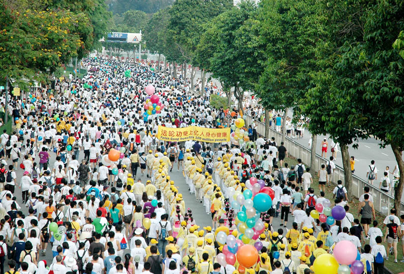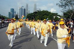 去年大竞走前,警方要求学员们不可以打腰鼓。法轮功学员们认识到,我们是新加坡合法注册团体,打腰鼓与否是我们的权利,不需要警方的批准。在大竞走中打腰鼓不仅可以向更多新加坡普通民众展示大法美好与法轮功学员风采,还能为大竞走增添乐趣,为何不可?于是腰鼓队堂堂正正出现在大竞走中,当时,警方紧张的派出大批便衣一直跟在腰鼓队的前后左右。