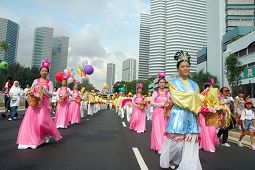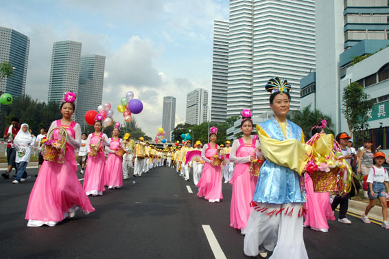 9名学员装扮成“仙女”,也惹来大家的好奇,掏出随身的手机为仙女拍照。虽然烈日当头,学员身着长衣长裙,却依然满面春风,向身边的人边走边讲真相。当人们发现仙女的花篮中藏有“宝物”(糖果和折纸莲花)时,纷纷前来索取,以期能给自己带来好运。