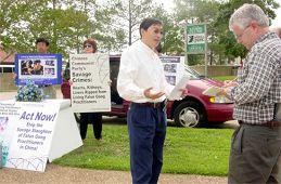 法轮功学员在亚历山大市政府前的停车场发表演讲,并展示法轮功受害者的照片。他们说,在中国,炼功者们被(中共)囚禁、酷刑折磨、摘取器官牟取暴利。