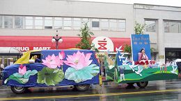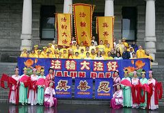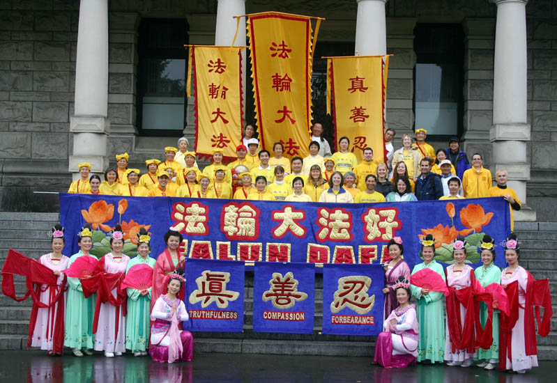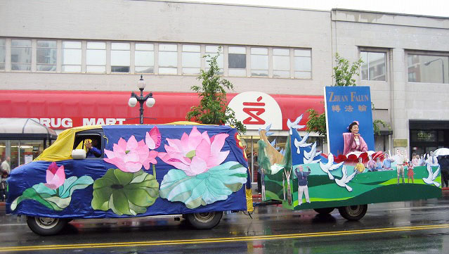 尽管下着雨,仍有4万多观众前来观看,游行上午9点从Mayfair Mall出发,沿着道格拉斯街道至市会议中心,于12点半结束,历时3个多小时。法轮功学员的游行队伍由腰鼓队、花车、舞蹈队和炼功队组成。队伍最前面的中英文“法轮大法好”横幅通过电视转播,给更多的民众留下了深刻的印象,看到了法轮大法的美好。