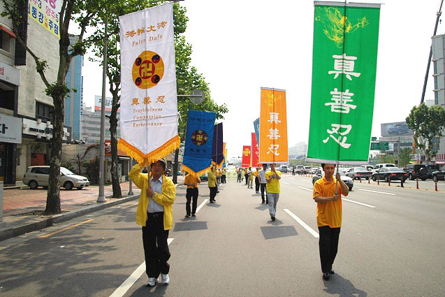 ![]() 游行队伍行進在大邱街道上 | ![]() 揭露中共活体摘取法轮功学员器官的演示车 |