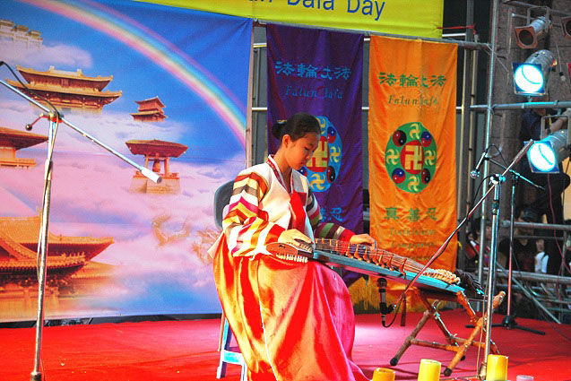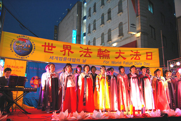 游行队伍到达的终点就是表演文艺节目的地方,是大邱市最繁华的市中心。临时搭设的舞台庄严神圣、祥和美好。节目有韩国的传统舞蹈、伽倻琴、小提琴、口琴演奏,独唱、诗朗诵及合唱,明慧学校的小弟子除了合唱“插莲花”和“飞越风雨的鸽子”,还朗诵了《洪吟》,所有节目都博得了热烈的掌声。