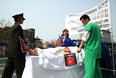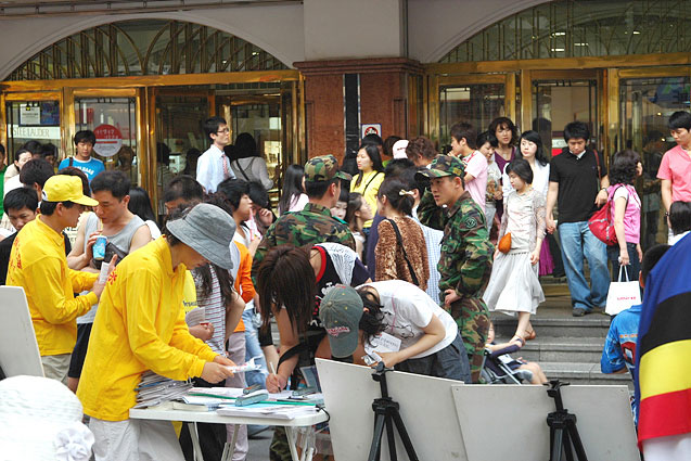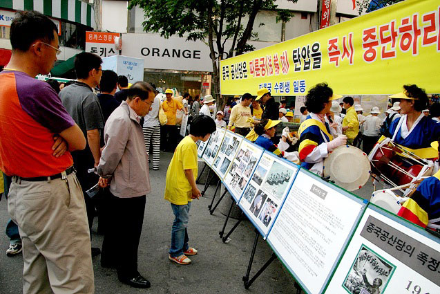 舞台两边的过道上是揭露中共暴行的酷刑展板,使路人同时同地看见了大法的美好及迫害者的邪恶。在如此直观鲜明的对比,使人一下子明白了真相,特别是当人们看到中共活体摘取法轮功学员器官真相时,众多的大邱人纷纷签名要制止这一人神共怒的暴行。
